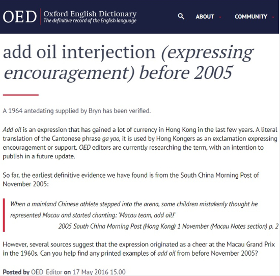 OED在词源(etymology)里追根究底,说add oil这个词组直译自中文的“加油”,广东话念ga yau,相当于国语的jiayou,并说文解字了一番。