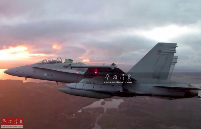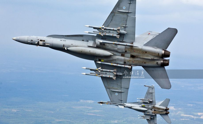 图为挂载有多枚美制AIM-120C中距空空导弹的芬兰空军F-18战机编队。