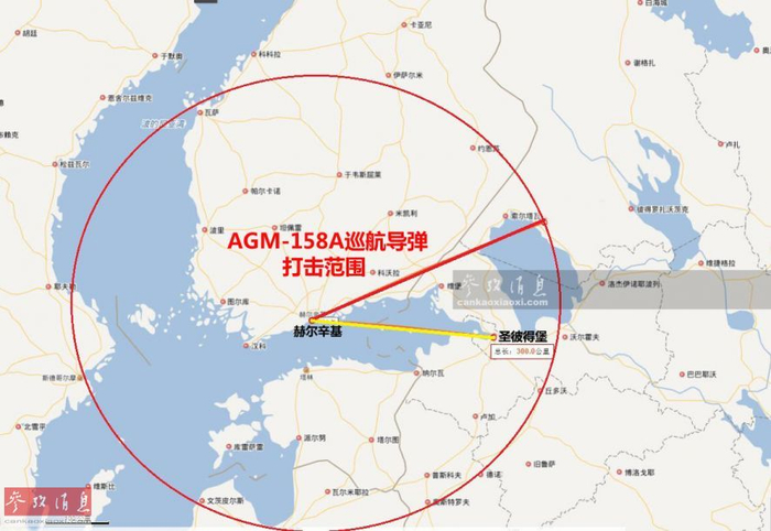 芬兰空军装备的JASSM巡航导弹为AGM-158A基本型的出口版,最大射程超过400千米,可搭载450千克级钻地弹头,精度可达3米内,这意味着芬兰F-18从本土基地起飞后,就可直接在芬兰国境内发射,射程就能覆盖到包括圣彼得堡在内的多个俄罗斯大城市,以及多个军事战略目标,威慑效果十分明显。图中的黄线为芬兰首都赫尔辛基到俄罗斯圣彼得堡的直线距离。