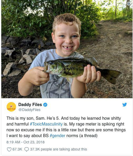这位来自马塞诸塞州的爸爸戈维亚在推特上发文:“这是我的儿子,山姆。今天,他认识到了‘可恶的男子气概’有多伤人。我感到非常愤怒,不好意思说些粗鲁的话,我真的想谈谈这狗屁‘性别准则’。”