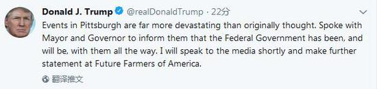发生在匹茨堡的事件比最初想象的严重得多。刚和(匹茨堡)市长、(宾夕法尼亚州)州长通了电话,告诉他们,联邦政府将一直与他们在一起。我很快将对媒体发表讲话,并会在美国未来农民协会发表进一步声明。