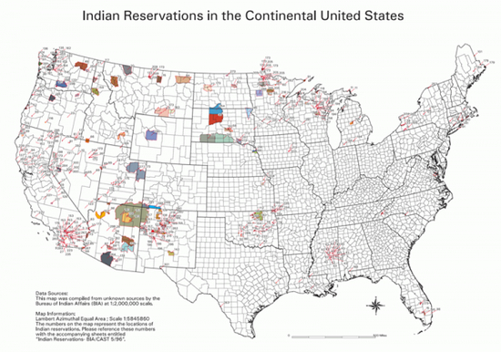 现在,美国有300多个保留地,大都分散在密西西比河以西,很多散落在西部山区,西部沿海,以及其它人烟罕至的地区,总面积加起来相当于爱达荷州 (Idaho) 大小。事实上,一百多年里,很多保留地的面积被缩减不少,原因在于联邦政府可以不同的理由重新分配土地或者直接划走。还有很多被迫迁移的原住民,至今没有得到政府承诺的补偿。近年来发生的一些冲突,大多与能源开发有关;那些白人原先不待见的土地(如干旱的山区),突然因其地下的天然气(或者其它资源)而被资本觊觎。