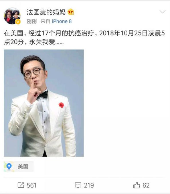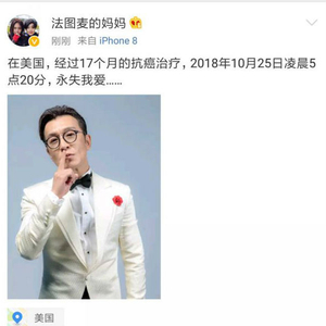 参考消息网10月29日报道 10月29日,李咏妻子(@法图麦的妈妈)在微博发文称:“在美国,经过17个月的抗癌治疗,2018年10月25日凌晨5点20分,永失我爱…… ”李咏1968年5月3日出生,今年年仅50岁。