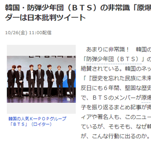 这篇题为《韩国防弹少年团穿“原子弹爆炸T恤”不可理喻,队长曾发批判日本推特》的报道10月26日发表在日本《东京体育》。文章批评BTS曾在韩国国内公开进行“反日活动”,身穿印有“原子弹爆炸”的T恤,还曾发表“反日言论”的推特。