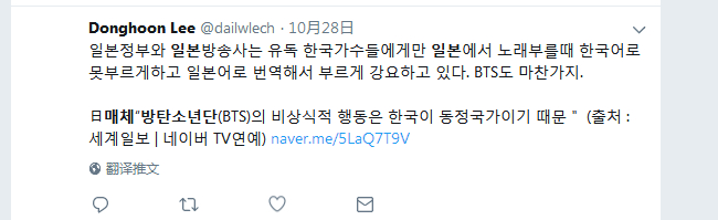 网友Donghoon Lee:日本政府和日本电视台唯独不让韩国歌手在日本用韩语唱歌,强迫他们翻译成日语唱。BTS也一样。