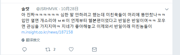 网友솔락:啊真的是。不想说重话的,疯子们的脑袋里装了大便吗。讨厌就别关注啊。你们自己喜欢,现在又跑来说什么反日。