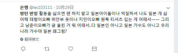 网友은챙:讨厌防弹的反日行动,就不要做他们的粉丝啊,去追日本的明星,我也讨厌日本。泰亨欧巴(BTS成员)穿慰安妇衣服,智旻欧巴(BTS成员)穿原子弹爆炸衣服,南俊欧巴(BTS成员)发推文又怎么样呢。他们都不是日本人也不是日本歌手,他们是韩国歌手,所以日本这是干嘛啊?