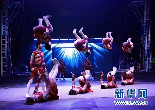 10月29日,中国济南杂技团在芝加哥表演杂技节目《蹬人》。 新华社记者汪平 摄