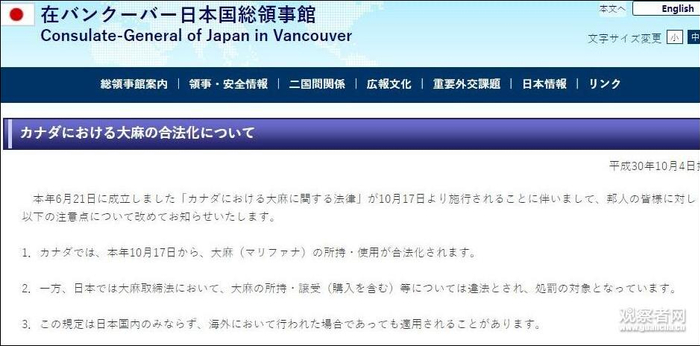 本月4日,日本驻温哥华总领事馆发布通告,呼吁日本公民即使在国外,也绝对不要触碰大麻(包括含有大麻的食品及饮料)。