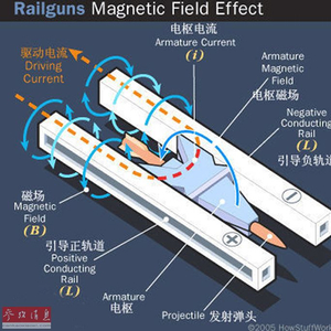 电磁弹射器的基本原理如下,通电导体在磁场中会受到磁场力的作用,电磁弹射就是用强电流通过电磁铁产生强磁场作用于连接飞机的牵引器上。牵引器位于磁场中的部分通强电流,就会受到磁场力作用产生加速度,使之带动飞机作加速运动,达到起飞速度后飞机脱离飞行甲板起飞。实际电磁弹射在原理上与电磁轨道炮有相似之处,但前者要复杂很多。图为电磁轨道炮原理示意图。