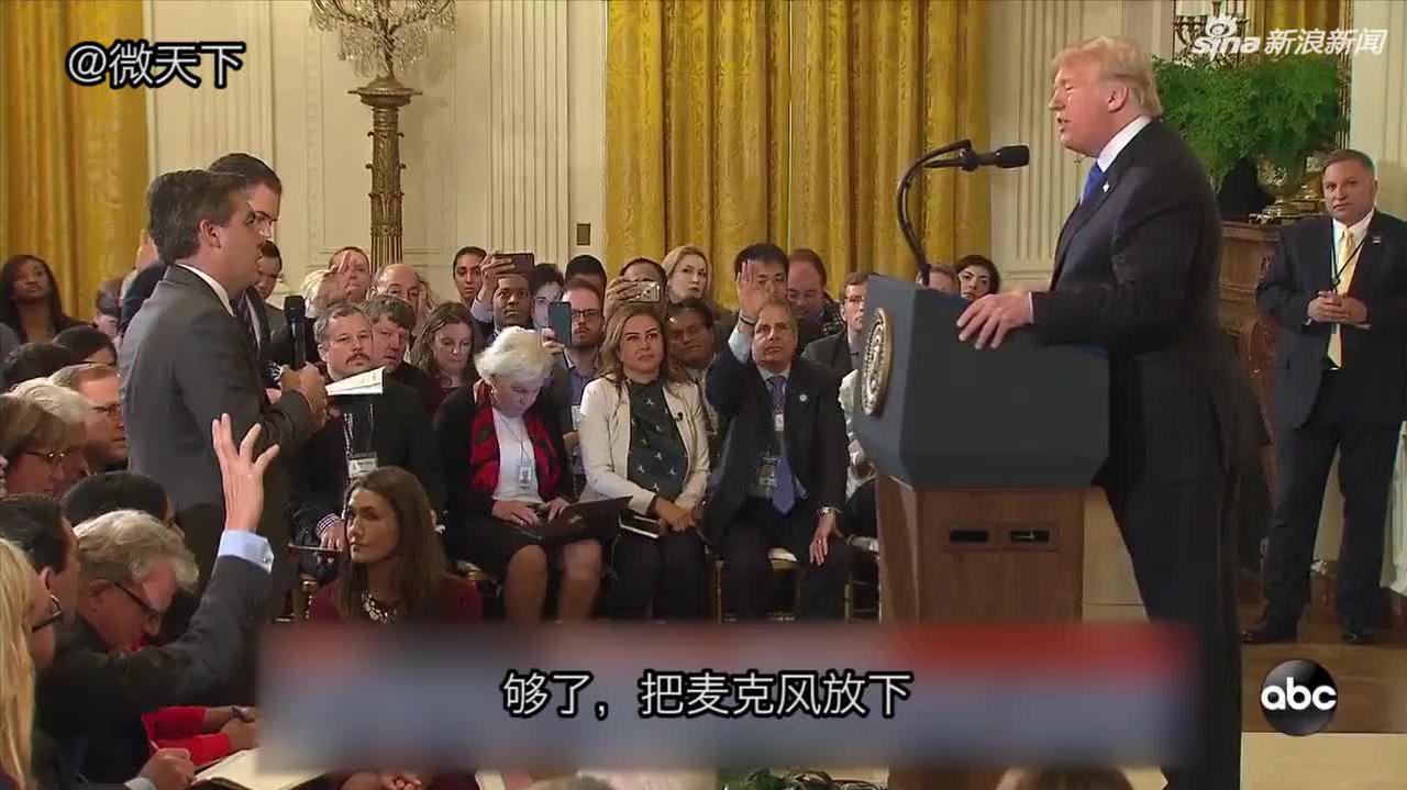 特朗普责令他“放下麦克风”。一番僵持后,阿科斯塔不得不停止发问,但特朗普随后开始在讲台上斥责他。