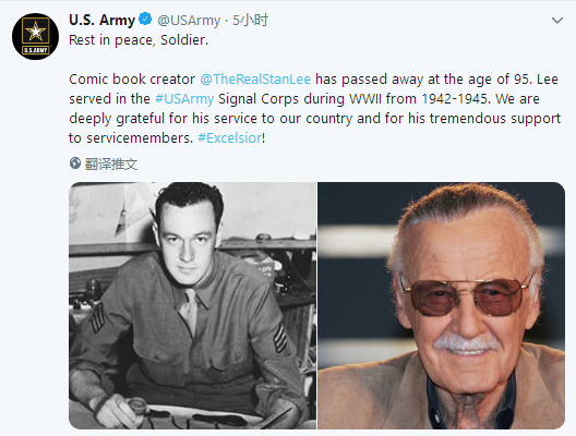 就连美国陆军也发文缅怀斯坦·李:安息吧, 战士。漫画创作家斯坦李刚刚去世, 享年95岁。他于1942至1945年二战期间在美国陆军信号兵团服役。他对美国所做的贡献我们深表感谢, 也感谢他对军队所做的巨大支持。