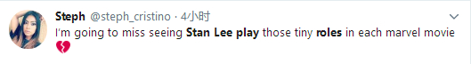 漫威影业主席凯文·费奇(Kevin Feige)在推特上发文表示,“斯坦·李对我的职业生涯以及对漫威影业的影响无人能及,他给我们留下了珍贵的遗产,我们与他的女儿、他的家人、他的无数粉丝同在”。
