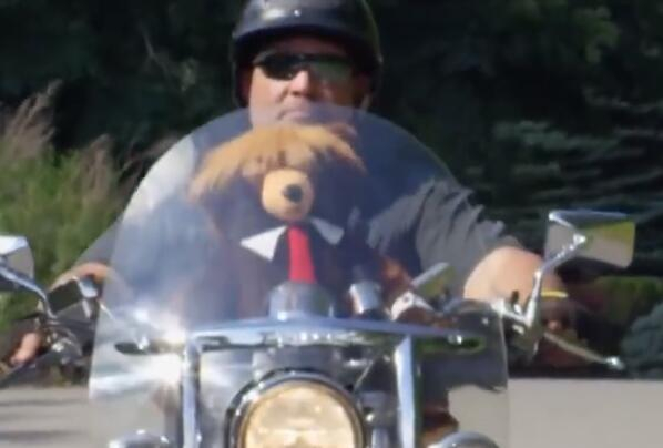 “特朗普熊熊”还和一名前海军陆战队队员同骑他最心爱的哈雷兜风。