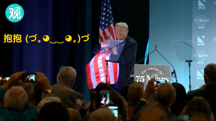 这幅画面不禁让人想起那个不管何时何地都要向美国国旗要抱抱的特朗普……