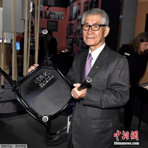 当地时间12月6日,2018年诺贝尔生理学或医学奖得主本庶佑展示其签名的椅子。