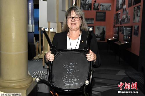 当地时间12月6日,2018诺贝尔物理学奖得主唐娜·斯特里克兰展示其签名的椅子。