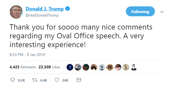 特朗普在推特中称:“谢谢你们给我的这次椭圆形办公室讲话这么这么这么多(Soooo many)的精彩评价。这是一次非常有趣的体验!”