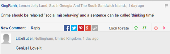 还有网友讽刺道,“罪犯应该被称为‘社会性举止失礼者’,刑期也应该改名为‘反思时间’”。