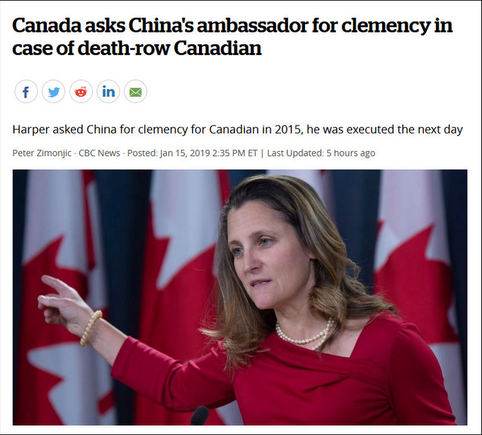 据加拿大广播新闻网(CBC)当地时间15日报道,弗里兰称,"我们(特鲁多政府)已经和中国驻加拿大大使谈过,请求中国仁慈。""加拿大对待死刑的立场是一贯的、长期的。加拿大没有死刑。我们认为,这是不人道且不恰当的。加拿大人无论在哪里面对死刑判决,我们都会发声反对。"