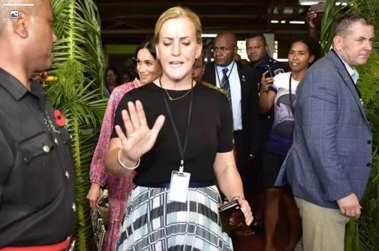 2018年10月,梅根访问斐济的时候在集市被围堵,这位女保镖霸气地冲在梅根前面保护她。