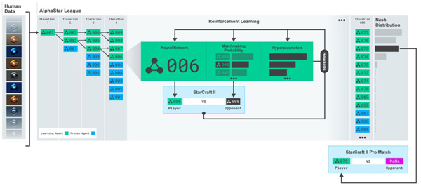 团队会使用一个称为“Alpha League”的方法。在这个方法中,Alpha League 的第一个竞争对手就是从人类数据中训练出来的神经网络,然后进行一次又一次的迭代,产生新的 agent 和分支,用以壮大“Alpha League”。