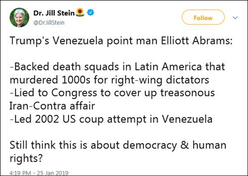 2012年及2016年美国总统大选绿党候选人吉尔·斯坦(Jill Stein)则罗列艾布拉姆斯的过往:“支持杀人小分队为拉美右翼独裁者谋杀了1000人、向国会撒谎掩盖‘伊朗门’事件、领导2002年美国在委内瑞拉发动政变”,她问道:“还认为这是民主和人权吗?”