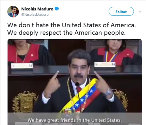 此外,他25日在推特发布视频称,“我们不恨美利坚合众国,我们深深地尊敬美国民众。我可以告诉你们,我深爱美国,爱它的历史、爱它的民众、爱它的文化。我们和美国有很深厚的友谊,我深深了解美国……”