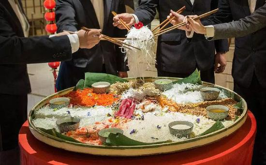 与中国人过年讲究年夜饭一样,新加坡华人过年也注重餐饮,其中“捞鱼生”是新加坡农历春节期间亲人团聚、公司团拜等必不可少的一道带有吉祥寓意的菜品。