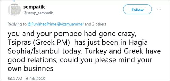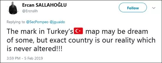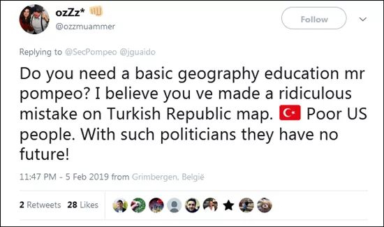 有人吐槽起了蓬佩奥的地理:“你需要基础地理教育吗,蓬佩奥先生?你在土耳其地图上犯了一个可笑的错误。可怜的美国人,有这样的政治家,他们没有前途了!”
