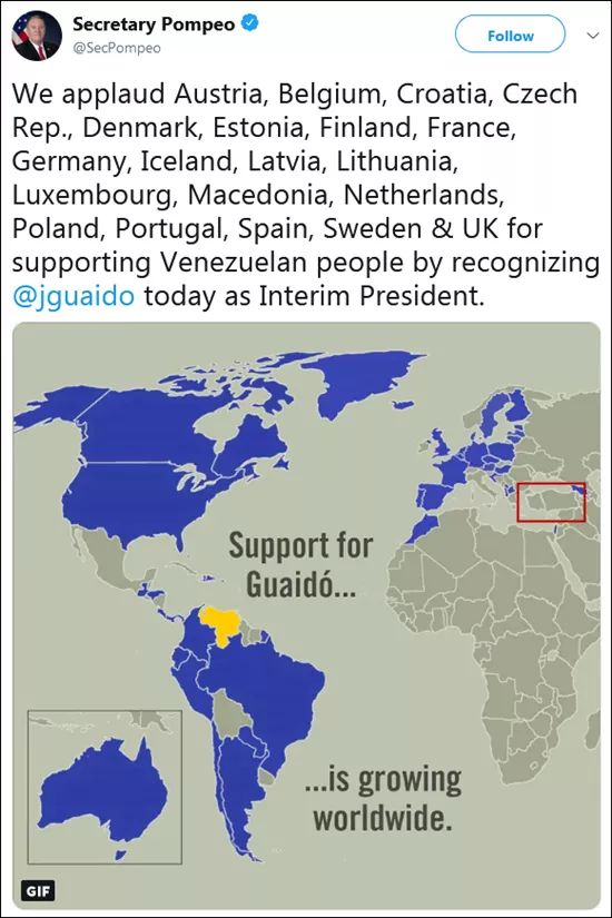 2月4日,德国、英国、法国等国宣布承认委内瑞拉反对派瓜伊多为该国“临时总统”,美国国务卿蓬佩奥也迫不及待在推特发了一条“炫耀”帖,却不料放错地图,激怒了土耳其网民。