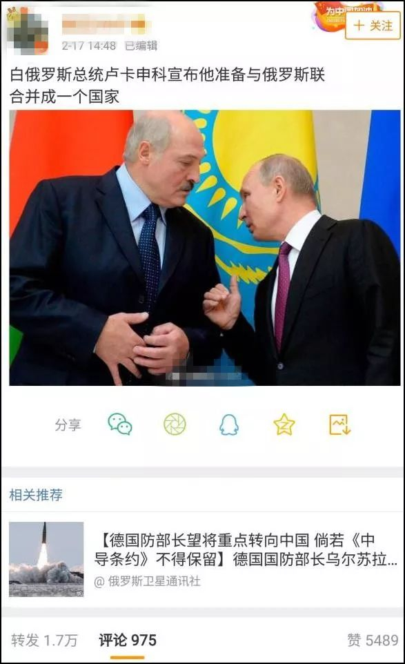 国内某些资讯微博号纷纷转发一条重磅消息,“白俄罗斯总统卢卡申科宣布准备与俄罗斯合并”,消息瞬间引爆舆论,该条微博转发高达1.7万次。