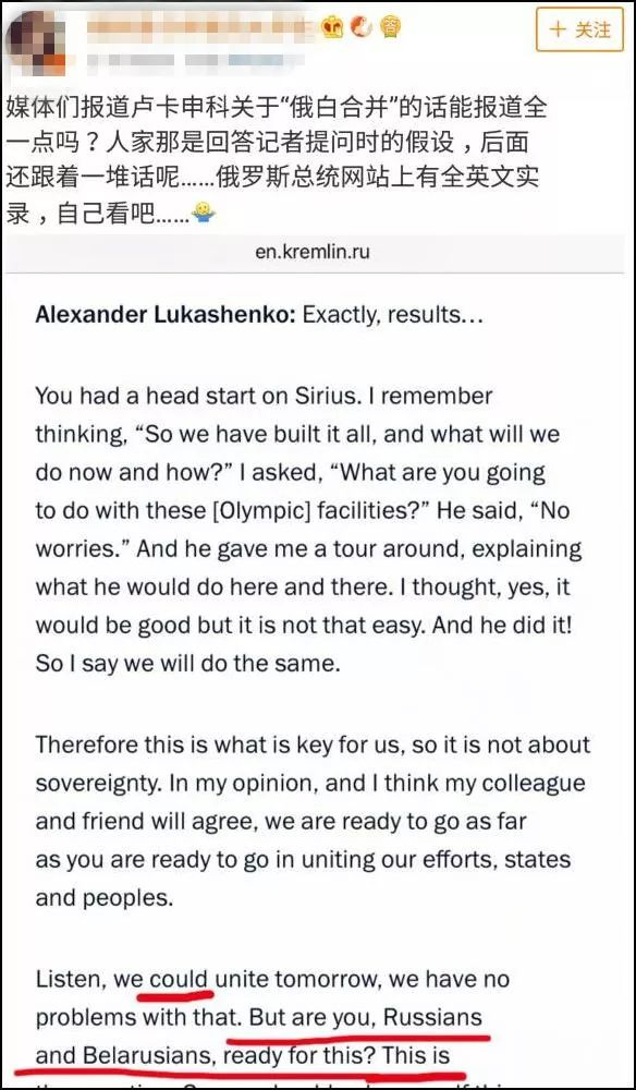 然而,也有细心网友表示质疑,“合并的事这么大,怎么可能这么草率?”网友查证称,卢卡申科在回答“记者假设”,还举证现场讲话实录,联系上下文分析语境。
