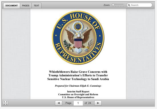 据美媒报道,美国众议院监督和改革委员会周二公布的一项最新报告显示,多名“检举者”揭露,特朗普政府高官一直在秘密试图将敏感核技术转移给沙特阿拉伯。