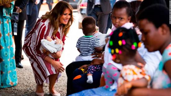 去年10月,梅拉尼娅还把“成为最好”运动带到非洲,访问加纳首都阿克拉时,特地去往当地一家医院,为孩子们发放玩具熊和毯子。