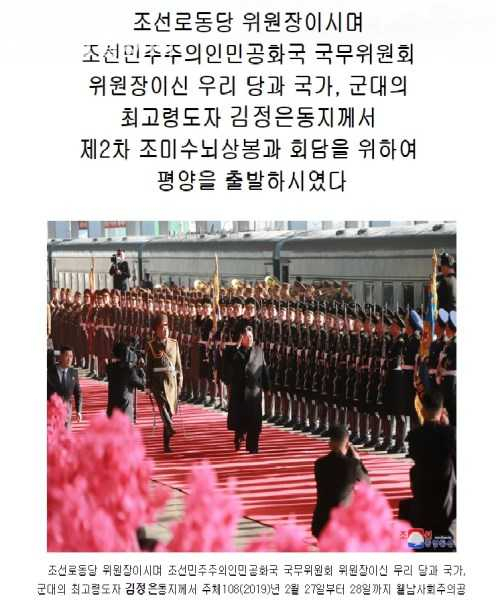 据朝中社24日报道,朝鲜劳动党委员长、朝鲜民主主义人民共和国国务委员会委员长金正恩为了举行将于2月27日至28日在越南河内进行的第二次朝美首脑会晤和会谈,23日下午乘专列离开平壤。