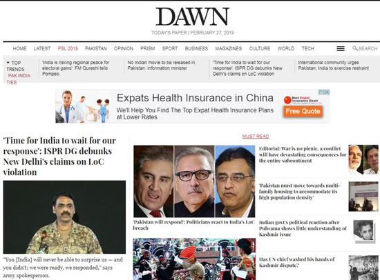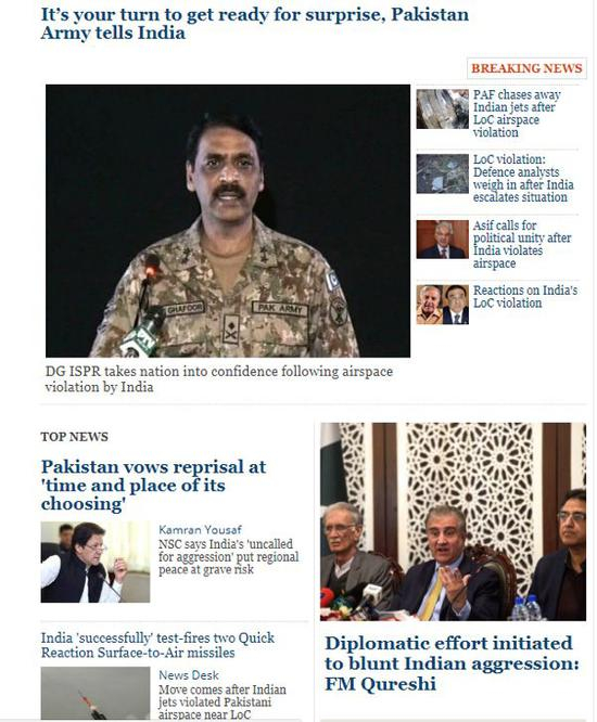 巴基斯坦《论坛快报》首页也是巴基斯坦军方警告印度的消息,要闻区放置消息称:“巴基斯坦誓言在其选择的时间和地点进行报复”。