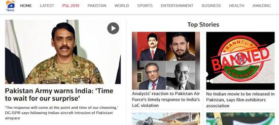 先来看巴基斯坦GEO电视台,它的首页几条消息都和印度有关,第一条写道:“巴基斯坦军方警告印度:‘是时候等我们出其不意了’。”其他新闻分别为:“分析人士对巴基斯坦空军及时回应印度违反停火协议的反应”、“巴基斯坦将对印度的侵略作出回应:外长库雷希”。