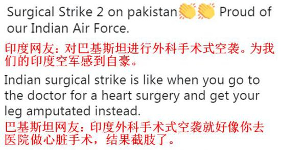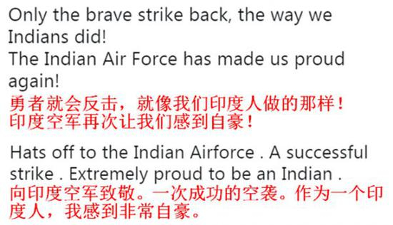 在一片赞美声中,“外科手术式打击”、“印度空军”和“印度反击”成了印度推特上最热的关键词。