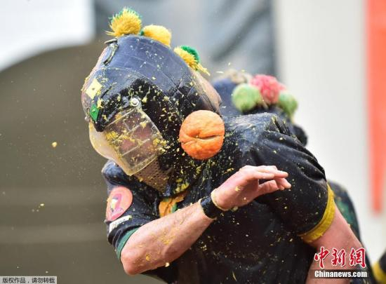中新网3月5日电 据香港《星岛日报》报道,当地时间3日,意大利北部小镇伊夫雷亚一年一度的“橙子大战”登场,在历时3日的活动中,大批市民和游客穿上传统服装,互相投掷橙子,气氛欢乐。不少人虽被砸得一头都是果肉和橙汁,但仍笑得开怀。