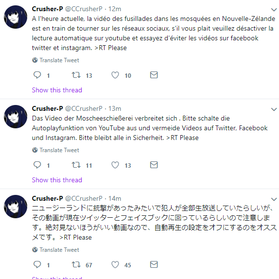 网友@CCrusherP则先后用法、德、日等多种语言,提醒人们注意不要看这段视频,并把推特设置成“不自动播放视频”↓