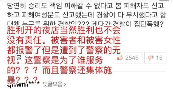 现场监控录像曝光后,点燃了韩国网民对胜利、YG公司和首尔警方的怒火。