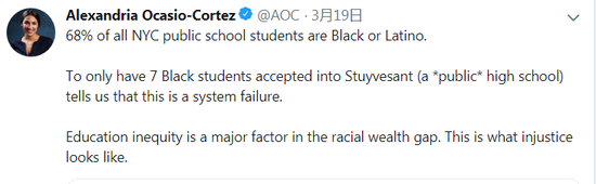 美国国会最年轻女议员亚历山大·奥卡西奥-科特兹发推特称,“教育的不公平是造成种族贫富差距的一个主要因素。这就是不公正。”