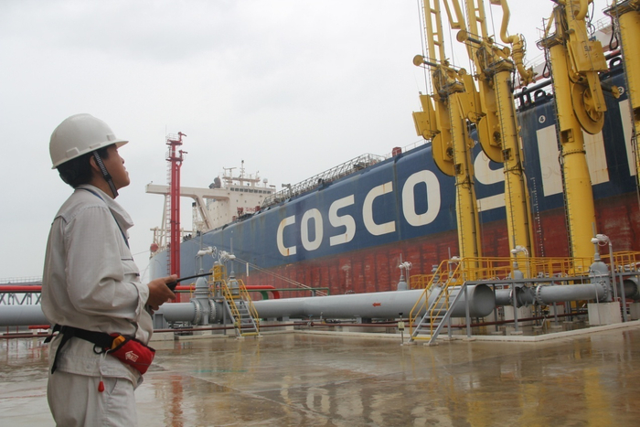 在5艘牵引船的牵引下,中远“远富湖”号油轮缓缓停靠在缅甸西海岸马德岛港。在30万吨码头上,3条长长的输油管分别降下,与油轮输油管口对接,开始向港口卸载原油,储存到单座储量为10万吨的储油罐内。然后经过检测、加压,经771公里的中缅原油管道,从南坎计量站进入中国。在并行的天然气管道内,从缅甸西南海域采集的天然气同样从南坎进入中国。