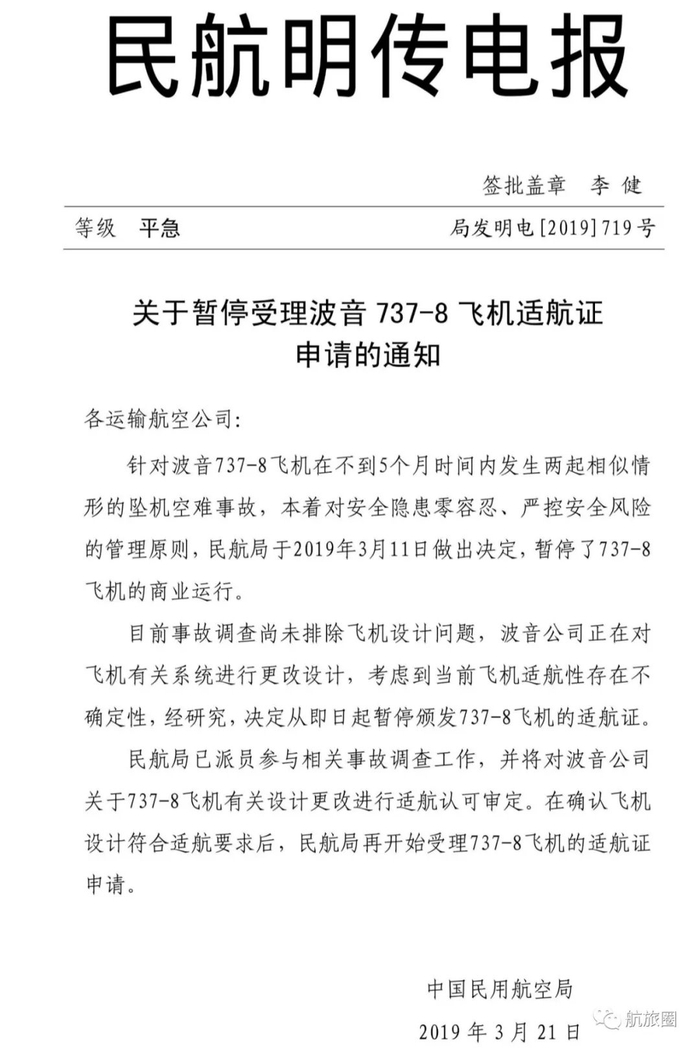 继3月11日民航局要求暂停737-8(即737 MAX 8)的商业运营后,民航局日前再发通知,宣布暂停受理波音737-8飞机适航证申请。