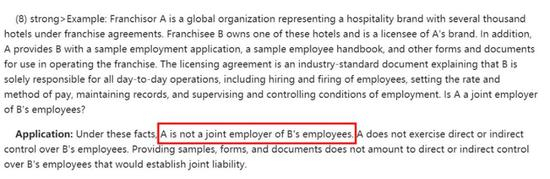 在劳工部给出的一项示例中,一个全球酒店品牌下有一家特许经营的加盟连锁酒店。但是,即使这家加盟店的经营材料都来自于这个品牌——例如就职申请和员工手册的示范等——但它依然不算这个品牌的联合雇主。