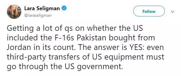 收到很多关于清点是否包括巴基斯坦从约旦购入的F-16的问题,答案是:包括。哪怕是第三方转让美国装备,也要经过美国政府。