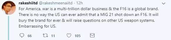 更多印度网友把矛头转向了美国,认为这是美国在“包庇”自己的军工企业,不肯承认自己的美制F-16战机被米格21击落的事实。