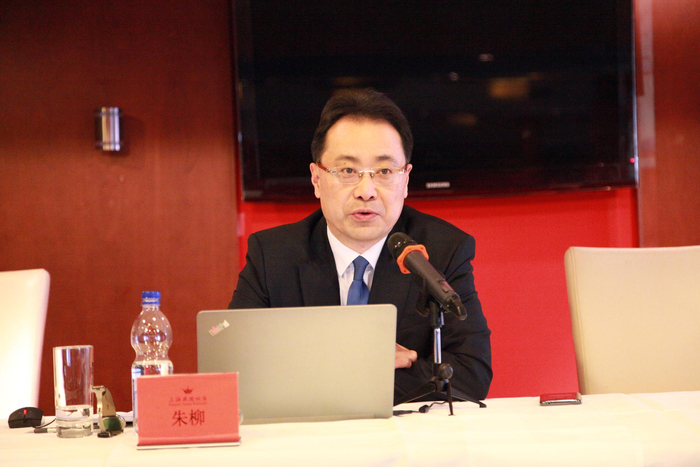图为中国侨联联络部副部长朱柳在为荷兰华人华侨作华人华侨与国家形象报告。