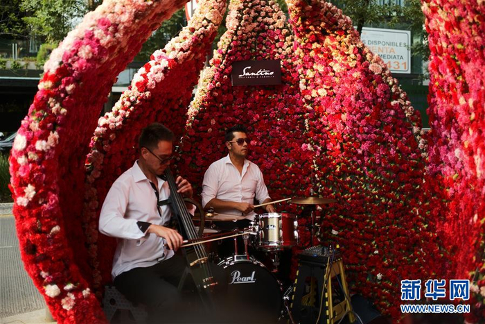 4月7日,在墨西哥首都墨西哥城的马萨里克总统大街,乐手在花艺作品中演奏。新华社记者 辛悦卫 摄